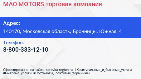 MAO MOTORS, торговая компания по адресу 140170, Московская область, Бронницы, Южная, 4 в дальнейшем Организация, размещена в следующих категориях: