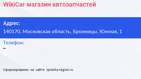 WikiCar, магазин автозапчастей по адресу 140170, Московская область, Бронницы, Южная, 1 в дальнейшем Организация, размещена в следующих категориях: