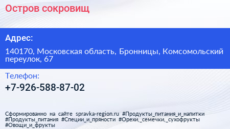 Остров сокровищ по адресу 140170, Московская область, Бронницы, Комсомольский переулок, 67 в дальнейшем Организация, размещена в следующих категориях: