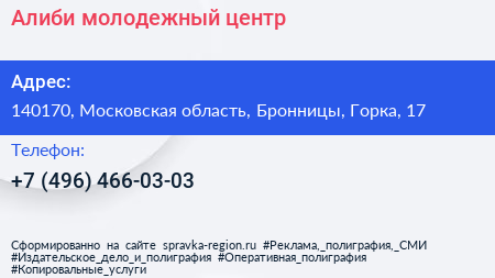Алиби, молодежный центр по адресу 140170, Московская область, Бронницы, Горка, 17 в дальнейшем Организация, размещена в следующих категориях: