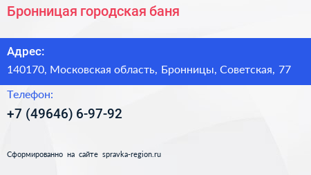 Бронницая городская баня по адресу 140170, Московская область, Бронницы, Советская, 77 в дальнейшем Организация, размещена в следующих категориях: