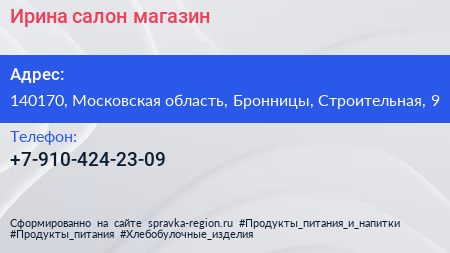 Ирина, салон-магазин по адресу 140170, Московская область, Бронницы, Строительная, 9 в дальнейшем Организация, размещена в следующих категориях: