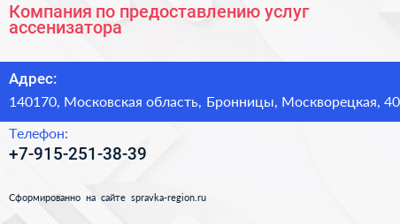 Компания по предоставлению услуг ассенизатора по адресу 140170, Московская область, Бронницы, Москворецкая, 40 в дальнейшем Организация, размещена в следующих категориях: