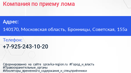 Компания по приему лома по адресу 140170, Московская область, Бронницы, Советская, 155а в дальнейшем Организация, размещена в следующих категориях: