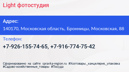 Light, фотостудия по адресу 140170, Московская область, Бронницы, Московская, 88 в дальнейшем Организация, размещена в следующих категориях: