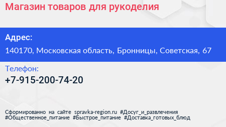 Магазин товаров для рукоделия по адресу 140170, Московская область, Бронницы, Советская, 67 в дальнейшем Организация, размещена в следующих категориях: