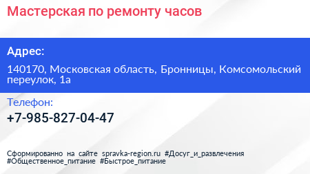 Мастерская по ремонту часов по адресу 140170, Московская область, Бронницы, Комсомольский переулок, 1а в дальнейшем Организация, размещена в следующих категориях: