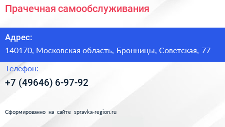 Прачечная самообслуживания по адресу 140170, Московская область, Бронницы, Советская, 77 в дальнейшем Организация, размещена в следующих категориях: