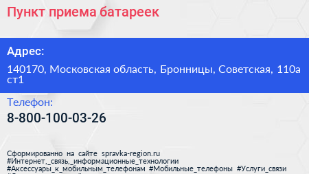 Пункт приема батареек по адресу 140170, Московская область, Бронницы, Советская, 110а ст1 в дальнейшем Организация, размещена в следующих категориях: