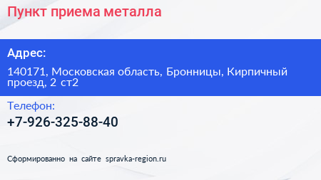 Пункт приема металла по адресу 140171, Московская область, Бронницы, Кирпичный проезд, 2 ст2 в дальнейшем Организация, размещена в следующих категориях: