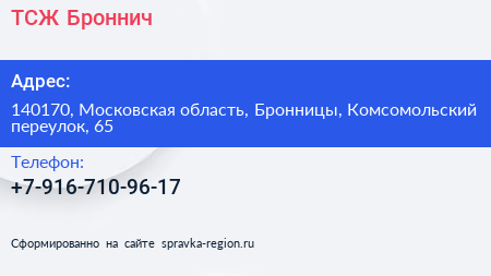 ТСЖ Броннич по адресу 140170, Московская область, Бронницы, Комсомольский переулок, 65 в дальнейшем Организация, размещена в следующих категориях: