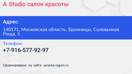 A`Studio, салон красоты по адресу 140171, Московская область, Бронницы, Соловьиная Роща, 5 в дальнейшем Организация, размещена в следующих категориях: