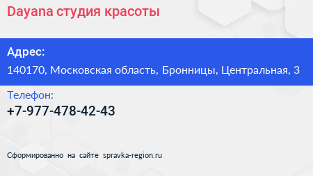 Dayana, студия красоты по адресу 140170, Московская область, Бронницы, Центральная, 3 в дальнейшем Организация, размещена в следующих категориях: