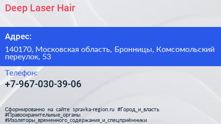 Deep Laser Hair по адресу 140170, Московская область, Бронницы, Комсомольский переулок, 53 в дальнейшем Организация, размещена в следующих категориях: