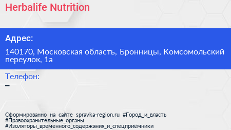Herbalife Nutrition по адресу 140170, Московская область, Бронницы, Комсомольский переулок, 1а в дальнейшем Организация, размещена в следующих категориях: