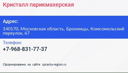 Кристалл, парикмахерская по адресу 140170, Московская область, Бронницы, Комсомольский переулок, 67 в дальнейшем Организация, размещена в следующих категориях: