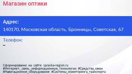 Магазин оптики по адресу 140170, Московская область, Бронницы, Советская, 67 в дальнейшем Организация, размещена в следующих категориях:
