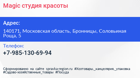 Magic, студия красоты по адресу 140171, Московская область, Бронницы, Соловьиная Роща, 5 в дальнейшем Организация, размещена в следующих категориях: