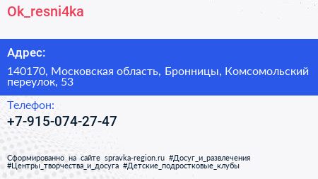 Ok_resni4ka по адресу 140170, Московская область, Бронницы, Комсомольский переулок, 53 в дальнейшем Организация, размещена в следующих категориях: