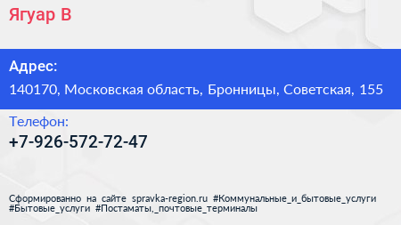 Ягуар-В по адресу 140170, Московская область, Бронницы, Советская, 155 в дальнейшем Организация, размещена в следующих категориях:
