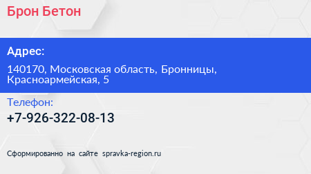 Брон Бетон по адресу 140170, Московская область, Бронницы, Красноармейская, 5 в дальнейшем Организация, размещена в следующих категориях: