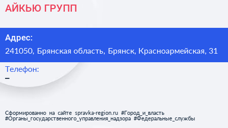 АЙКЬЮ ГРУПП по адресу 241050, Брянская область, Брянск, Красноармейская, 31 в дальнейшем Организация, размещена в следующих категориях:
