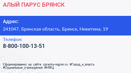 АЛЫЙ ПАРУС-БРЯНСК по адресу 241047, Брянская область, Брянск, Никитина, 19 в дальнейшем Организация, размещена в следующих категориях:
