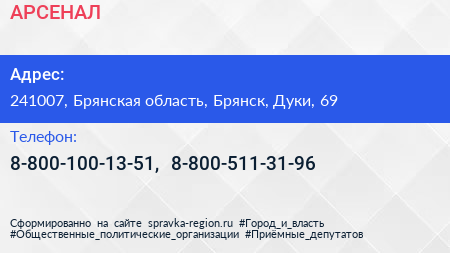 АРСЕНАЛ по адресу 241007, Брянская область, Брянск, Дуки, 69 в дальнейшем Организация, размещена в следующих категориях: