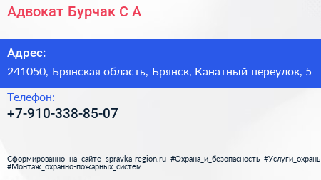 Адвокат Бурчак С.А. по адресу 241050, Брянская область, Брянск, Канатный переулок, 5 в дальнейшем Организация, размещена в следующих категориях: