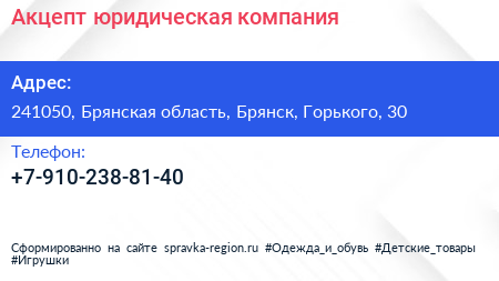 Акцепт, юридическая компания по адресу 241050, Брянская область, Брянск, Горького, 30 в дальнейшем Организация, размещена в следующих категориях:
