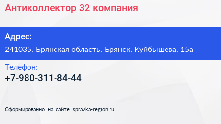 Антиколлектор 32, компания по адресу 241035, Брянская область, Брянск, Куйбышева, 15а в дальнейшем Организация, размещена в следующих категориях: