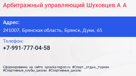 Арбитражный управляющий Шуховцев А.А. по адресу 241007, Брянская область, Брянск, Дуки, 65 в дальнейшем Организация, размещена в следующих категориях: