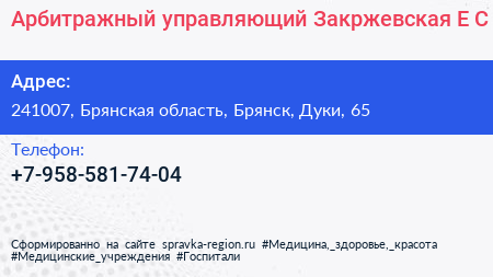Арбитражный управляющий Закржевская Е.С. по адресу 241007, Брянская область, Брянск, Дуки, 65 в дальнейшем Организация, размещена в следующих категориях: