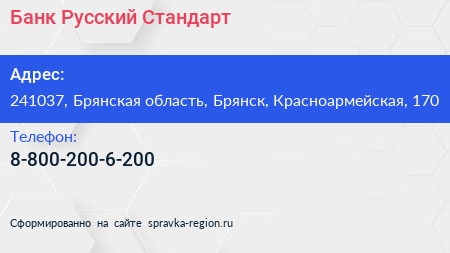 Банк Русский Стандарт по адресу 241037, Брянская область, Брянск, Красноармейская, 170 в дальнейшем Организация, размещена в следующих категориях: