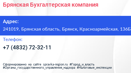 Брянская Бухгалтерская компания по адресу 241019, Брянская область, Брянск, Красноармейская, 136Б в дальнейшем Организация, размещена в следующих категориях: