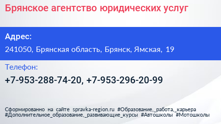 Брянское агентство юридических услуг по адресу 241050, Брянская область, Брянск, Ямская, 19 в дальнейшем Организация, размещена в следующих категориях: