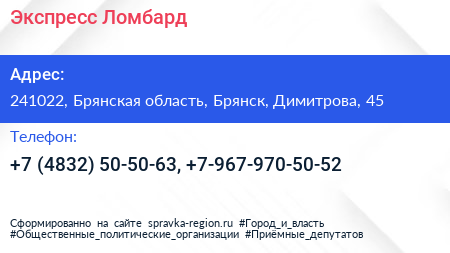Экспресс-Ломбард по адресу 241022, Брянская область, Брянск, Димитрова, 45 в дальнейшем Организация, размещена в следующих категориях: