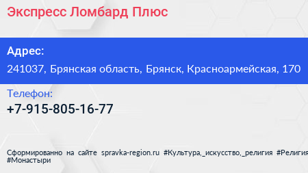 Экспресс-Ломбард Плюс по адресу 241037, Брянская область, Брянск, Красноармейская, 170 в дальнейшем Организация, размещена в следующих категориях: