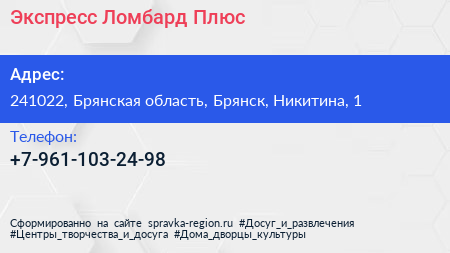 Экспресс-Ломбард Плюс по адресу 241022, Брянская область, Брянск, Никитина, 1 в дальнейшем Организация, размещена в следующих категориях: