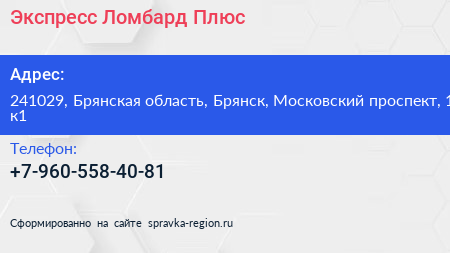 Экспресс-Ломбард Плюс по адресу 241029, Брянская область, Брянск, Московский проспект, 1 к1 в дальнейшем Организация, размещена в следующих категориях: