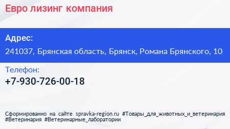 Евро лизинг, компания по адресу 241037, Брянская область, Брянск, Романа Брянского, 10 в дальнейшем Организация, размещена в следующих категориях: