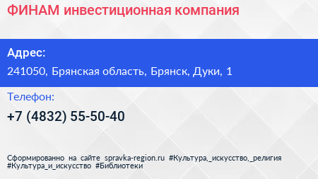 ФИНАМ, инвестиционная компания по адресу 241050, Брянская область, Брянск, Дуки, 1 в дальнейшем Организация, размещена в следующих категориях: