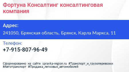 Фортуна-Консалтинг, консалтинговая компания по адресу 241050, Брянская область, Брянск, Карла Маркса, 11 в дальнейшем Организация, размещена в следующих категориях: