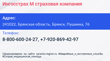 Ингосстрах-М, страховая компания по адресу 241022, Брянская область, Брянск, Пушкина, 76 в дальнейшем Организация, размещена в следующих категориях: