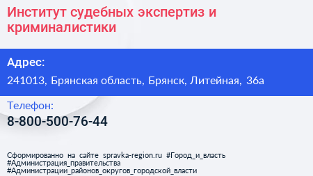Институт судебных экспертиз и криминалистики по адресу 241013, Брянская область, Брянск, Литейная, 36а в дальнейшем Организация, размещена в следующих категориях: