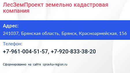 ЛесЗемПроект, земельно-кадастровая компания по адресу 241037, Брянская область, Брянск, Красноармейская, 156 в дальнейшем Организация, размещена в следующих категориях: