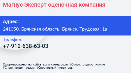 Магнус Эксперт, оценочная компания по адресу 241050, Брянская область, Брянск, Трудовая, 1а в дальнейшем Организация, размещена в следующих категориях: