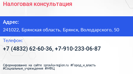 Налоговая консультация по адресу 241022, Брянская область, Брянск, Володарского, 50 в дальнейшем Организация, размещена в следующих категориях: