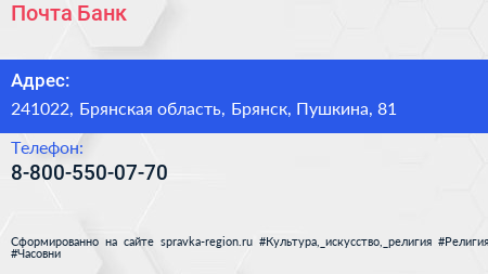 Почта Банк по адресу 241022, Брянская область, Брянск, Пушкина, 81 в дальнейшем Организация, размещена в следующих категориях:
