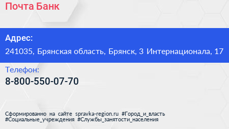 Почта Банк по адресу 241035, Брянская область, Брянск, 3 Интернационала, 17 в дальнейшем Организация, размещена в следующих категориях: